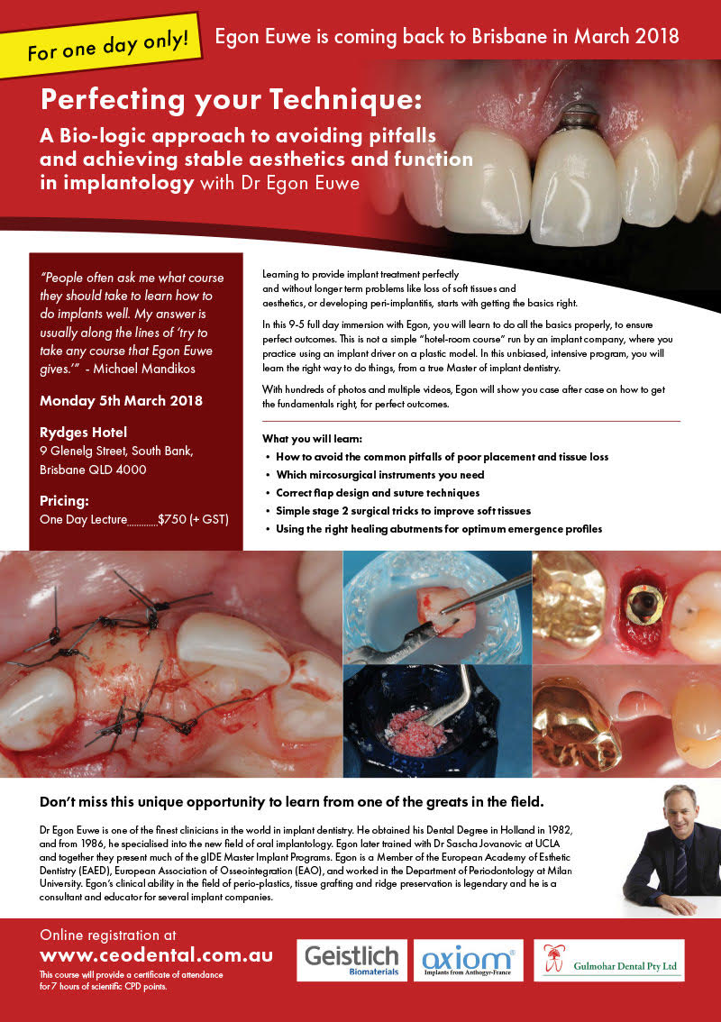 A one day lecture for those Dentists wanting to learn the best techniques from the start or for those who want to improve on the procedures they are already doing. CEO Dental Seminars brings to you Egon Euwe.